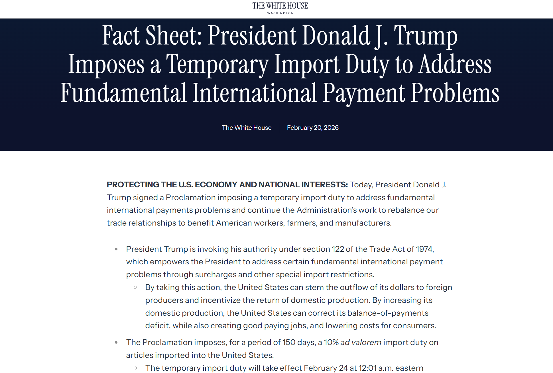 2026年2月23日,美国依据《1974年贸易法》第122条发布公告,对相关进口商品征收10%临时附加税。